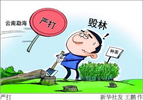 受经济利益诱惑和驱使,勐海县部分茶区近年来出现毁林种茶现象。为增加茶树产量,一些村民擅自违法砍伐集体林地内树木、放火烧树甚至以围剥树皮让树木枯死的方式毁林,非法侵占林地,破坏植被。但茶树属于经济作物,不能取代林木,毁林种茶系违法行为,不仅破坏生态环境,也对茶树生长有不良影响。勐海县为守好“绿色家底”,展开严厉打击非法侵占林地、非法种茶毁林等违法违规行为,并按照保持生物多样性的原则开展恢复植被行动。
