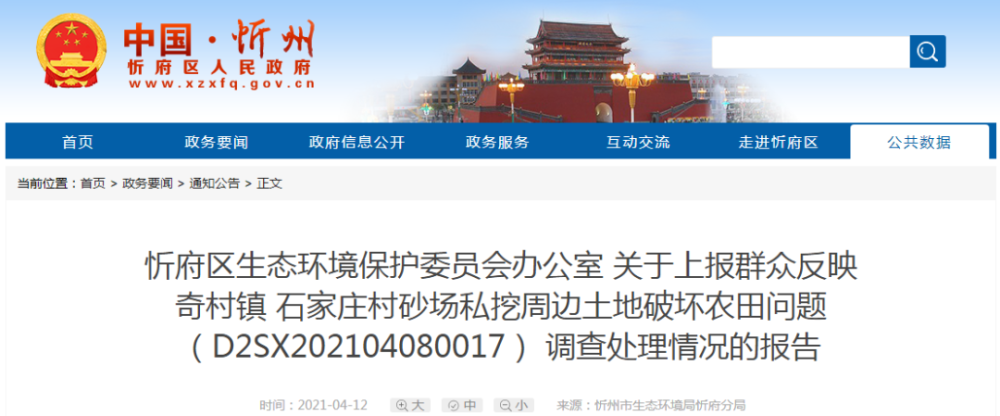 2021年4月8日,接到市中央生态环境保护督察协调联络组转办通知后,我区高度重视,当日即由忻府区生态环境保护委员会就“三交镇官庄村有个人在河道两侧挖沙、破坏耕地,乱砍树木,多次反映一直未处理”问题(D2SX202104080071),组织忻府区三交镇、区自然资源局、区林业局、区水利局展开调查。现将有关情况报告如下: