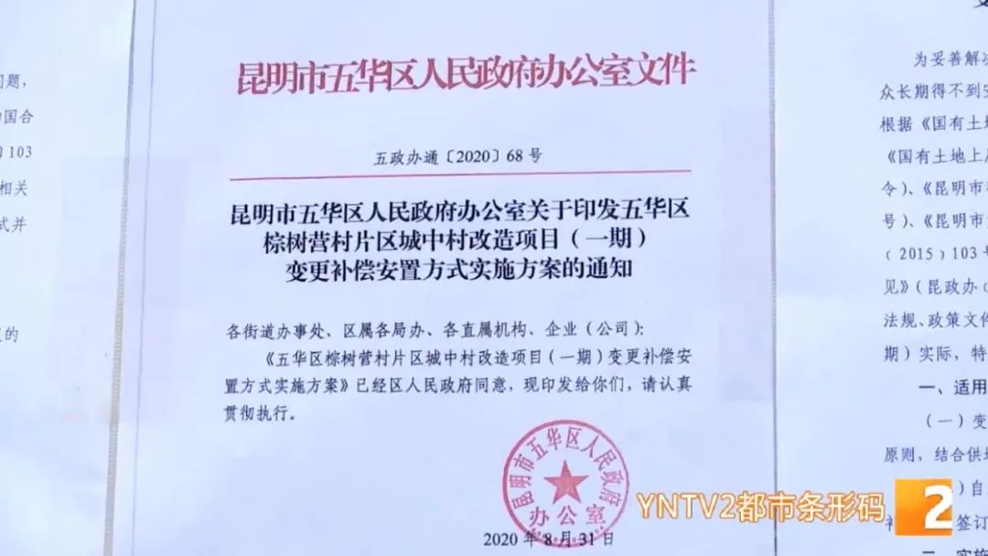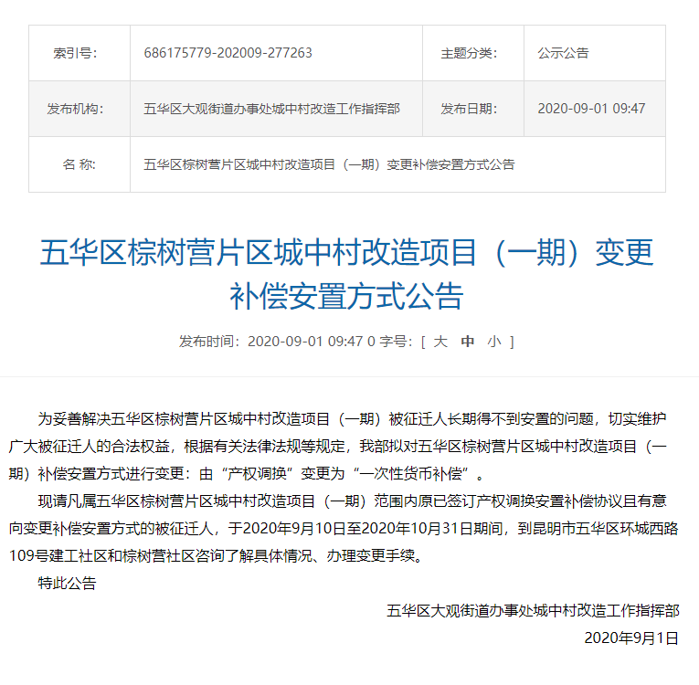 五华区大观街道办事处城中村改造工作指挥部发布公告称,拟对五华区棕树营片区城中村改造项目(一期)补偿安置方式进行变更:由“产权调换”变更为“一次性货币补偿”。
