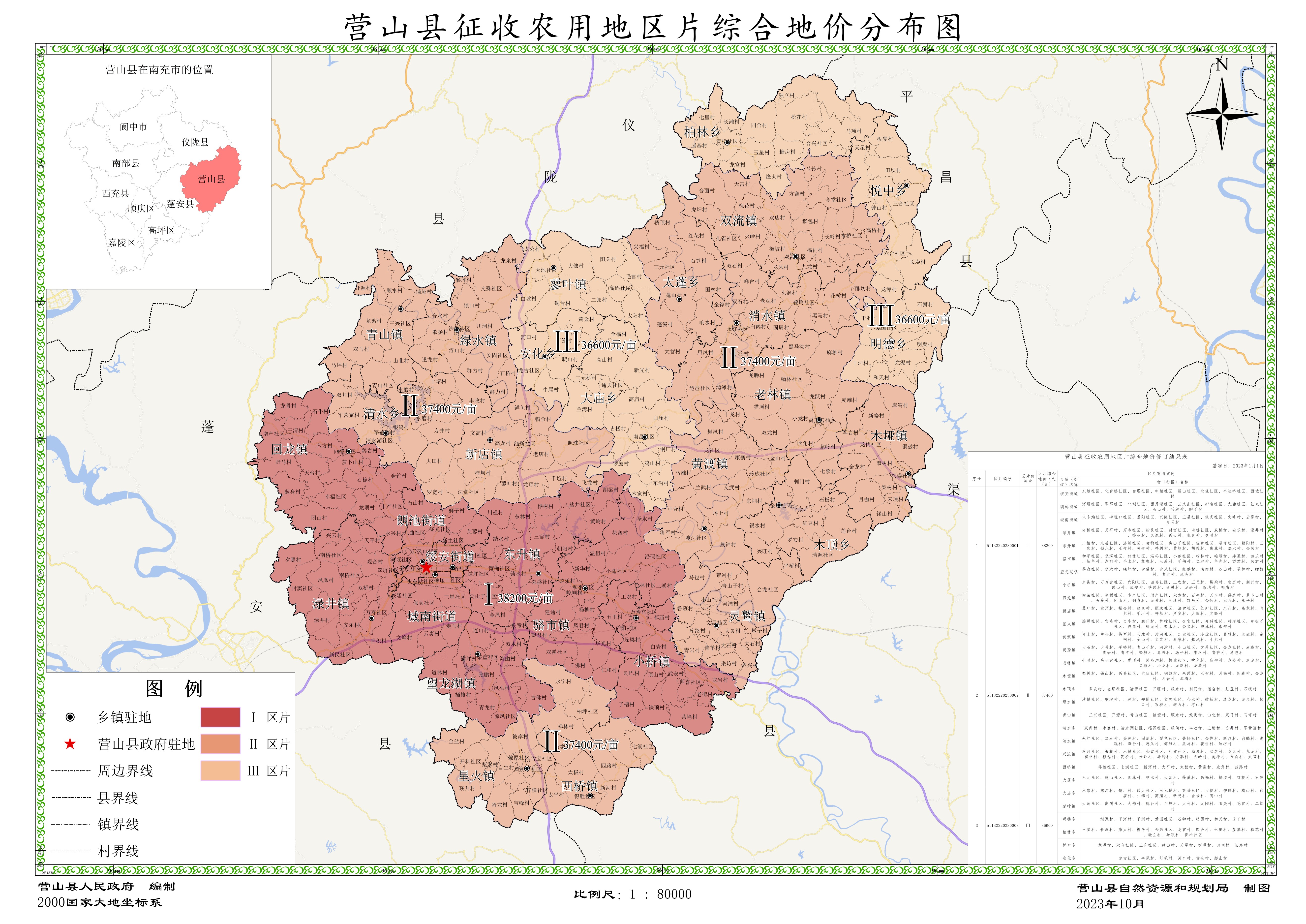 南 充 市 | 营 山 县 | Ⅱ | 新店镇 | 蓼叶村、龙顶村、帽合村、鲜鱼村、照珠社区、法堂社区、红新社区、老店村、高龙村、飞龙村、千坵村、梓坝村、罗宽村、大田村、文高村 | 37400 | 土地补偿费40%,安置补助费60% | |
