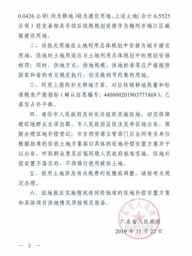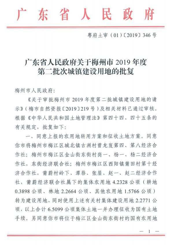 1、《广东省人民政府关于梅州市2019年度第二批次城镇建设用地的批复》(粤府土审(01)〔2019〕346号)