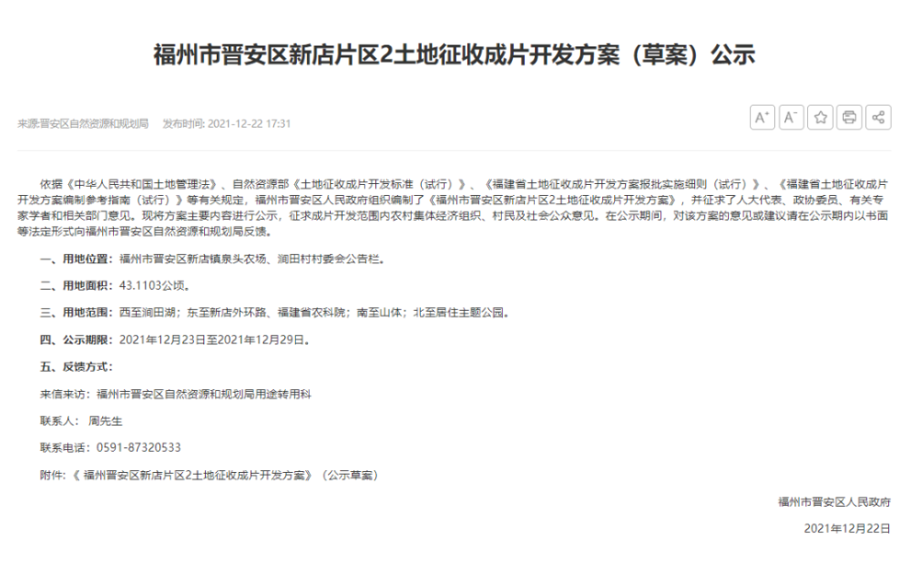【收案公告】凯诺律师团阶介入黑...日前,晋安区政府网站公示了新店片区2土地征收成片开发方案(公示草案),涉及用地面积约43.1103公顷(合616.6545亩),将于2021-2023三年实施完毕。