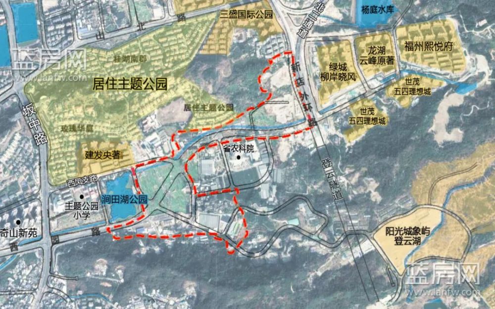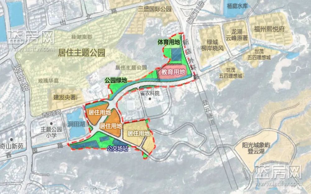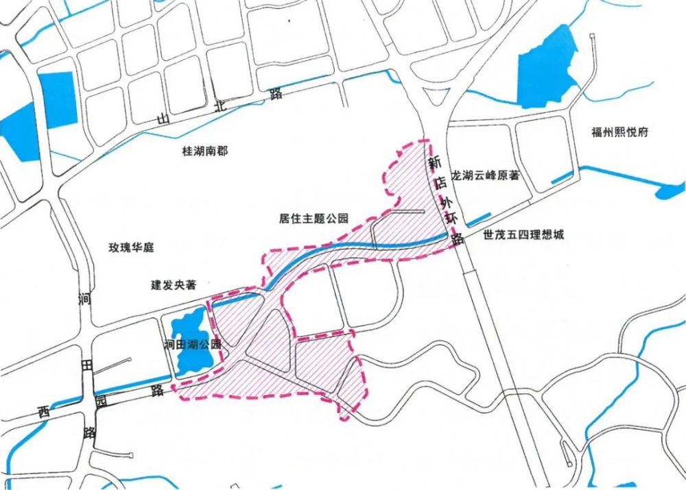 本方案西至涧田湖,东至新店外环路、福建省农科院,南至山体,北至居住主题公园。根据勘测调查,本方案成片开发用地总规模43.1103公顷(合616.6545亩)。