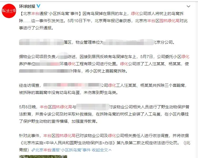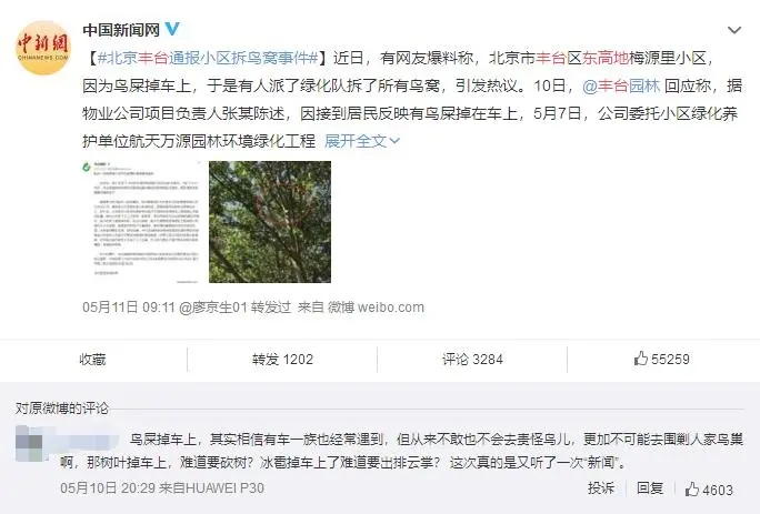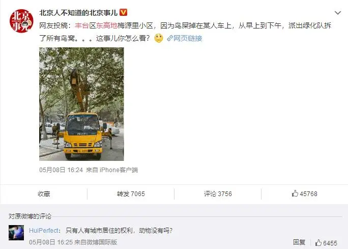 然而,近日有媒体爆出,北京丰台某地一小区有居民反映,有鸟屎掉到了停放在小区内的汽车上,随后,小区物业公司委托绿化养护单位拆除了小区内树上的三个鸟窝。