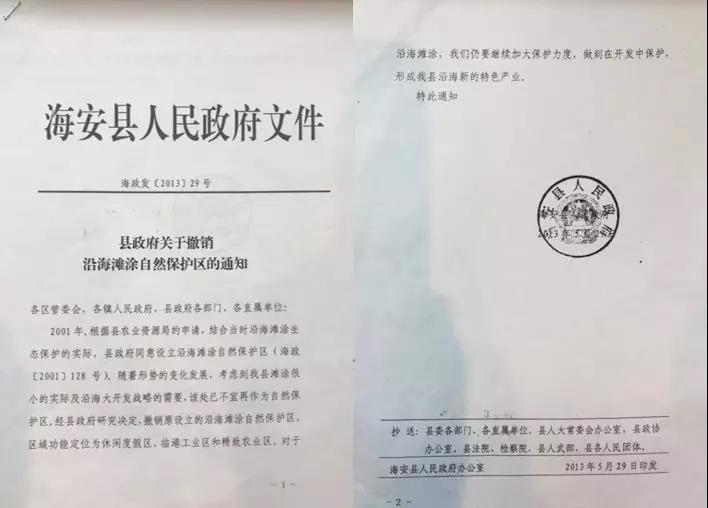 早在2010年8月,海安县人民政府就谋划撤销保护区,向江苏省环保厅报告海安沿海滩涂资源有限,已不宜设立保护区,拟实施滩涂开发。2013年发文撤销保护区并开展实质开发后,海安县又试图通过调整保护区的形式确认撤销保护区的实质,2018年8月28日,海安市人民政府向南通市人民政府上报请示,提出“该区域内(注:保护区内)存在部分较成熟的建设项目,对地方经济发展有着较大的贡献,但长期的开发建设活动,已使该区域失去了生态功能保护价值”,要求调整保护区。